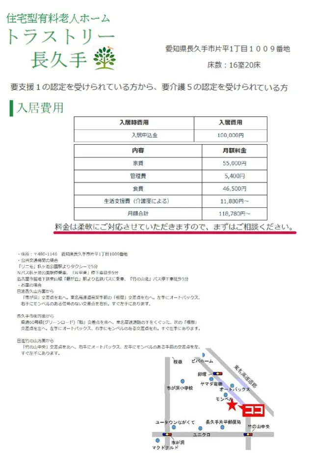 | 施設コメント | 古戦場のある場所として、歴史の教科書にも登場する長久手市。閑静な住宅街が広がるこの場所で、安心と安全に彩られた快適な介護をご提供しています。近隣の医療機関・訪問看護との協力を密にし、普段の健康状態管理から万が一の時の対応まで、安心感のある体制を作り上げています。 |